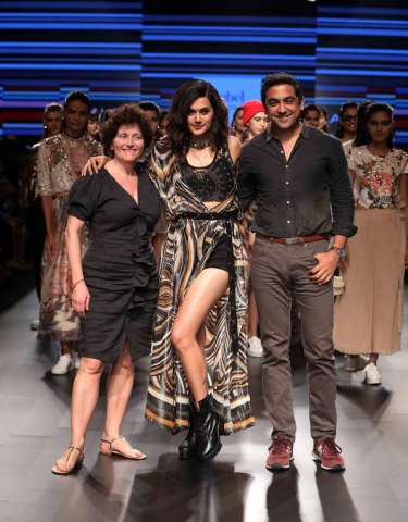 Making a fast pace zingy entry was the lovely, Bollywood, beauty, Tapsee Pannu, in a swinging long op-art, print, shimmering, robe over a black lace inner.