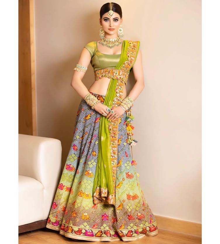 Urvashi Rautela goes down the desi route as she chooses to wear an Asha Gautam bandhani lehenga for Manoj Kumar's granddaughter Muskan's wedding. She looked stunning in the lehenga set which boasted a three colour ombre skirt with a lustrous green blouse. The outfit was paired with organza dupatta with a petit point border and tagdi with flower and bird designs.