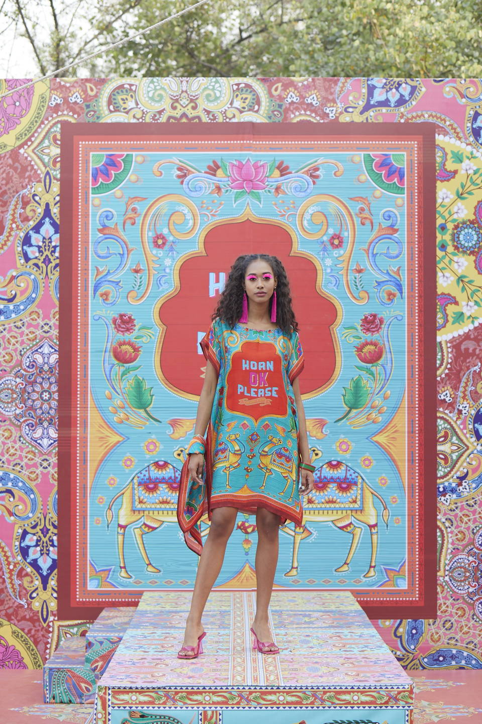 Horn Ok Please, which is inherent with candy-coloured murals, South Asian traditional floral and bird motifs drenched in hues of tangerine, canary, plum and watermelon. It's a one-stop shop for all silhouettes, from sarees to kaftans, shift dresses to Anarkali, crisp pant suits to Salwar Kurtas, crop tops and balloon pants to maxi dresses.
